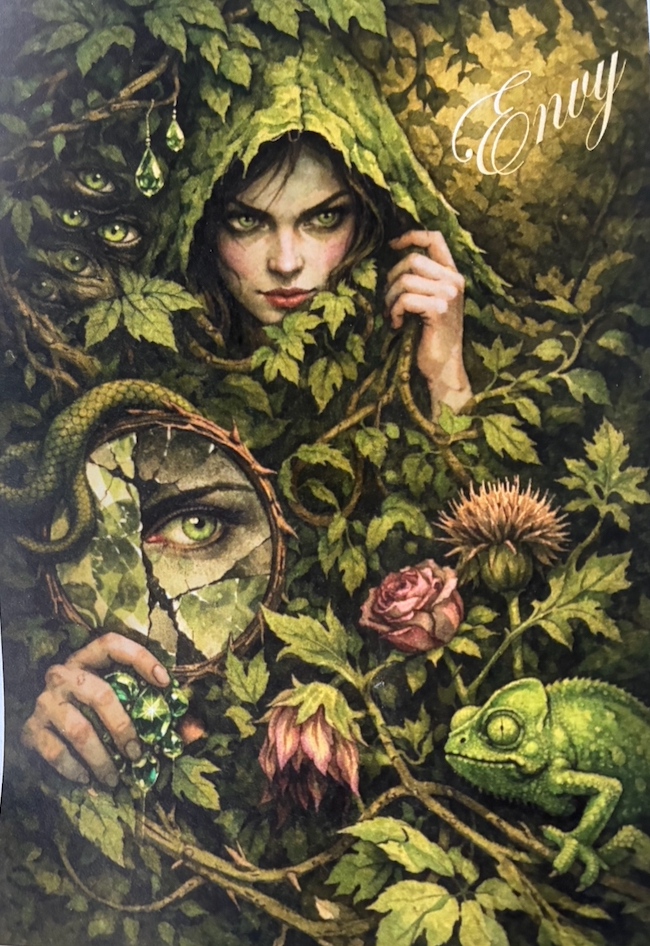 As a group, we thought the illustration for Envy was fabulous. One member asked to look at all the eyes, all green, and notice how cold envy is. Another said that Envy is the only deadly sin that gives no pleasure. We only have six weeks; it makes me laugh to know that the deadly sin of Lust is optional.