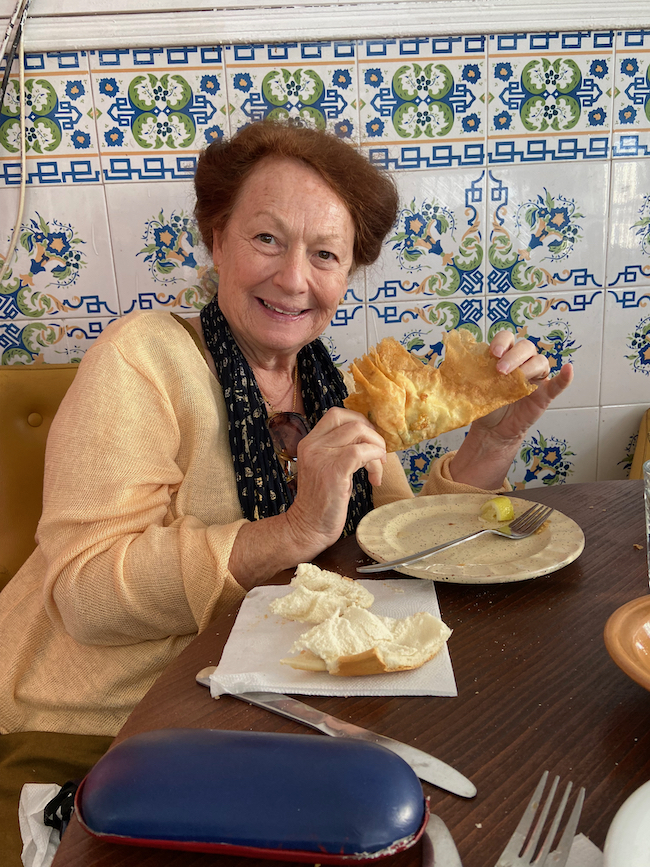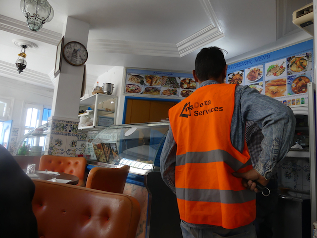 It’s going to be a couple hours ride back to the ship, but the guide has a treat for us – “Snacks” at a local restaurant, part of the tour, no extra charge. The small restaurant was just big enough to hold all of us, had a nice clean restroom and place to wash up, and served these delicious sandwiches, followed by a selection of house baked Moroccan cookies, and Turkish coffee or Mint Tea. The owner and his wife were so hospitable. They made us feel like very special guests. It really was a treat!