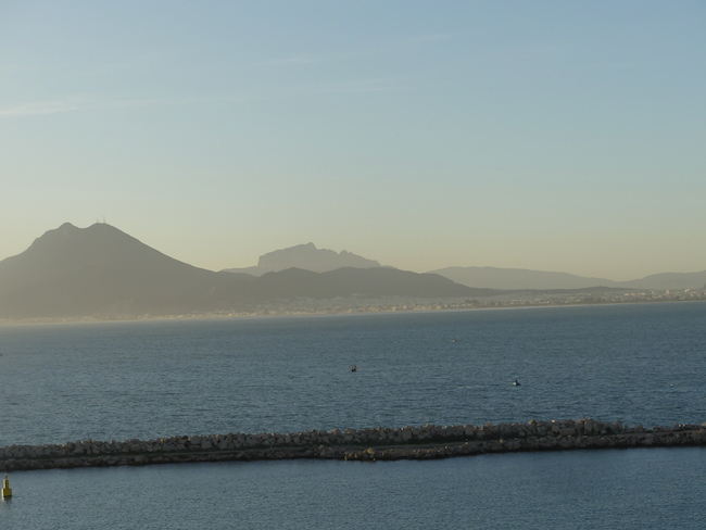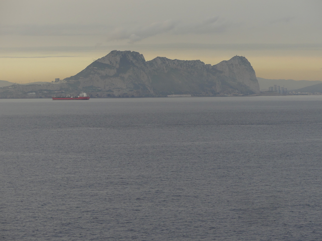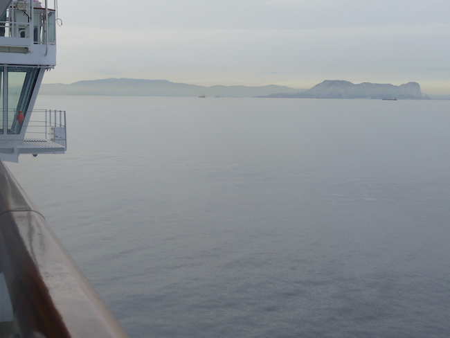 Late in the afternoon, the Captain announces we will be passing The Rock of Gibralter. We have passed the iconic rock many times by ship – but always at night. This is our first daylight passage. But look at the sky, so flat, the light, so flat. Oh well, you take the shot you have.