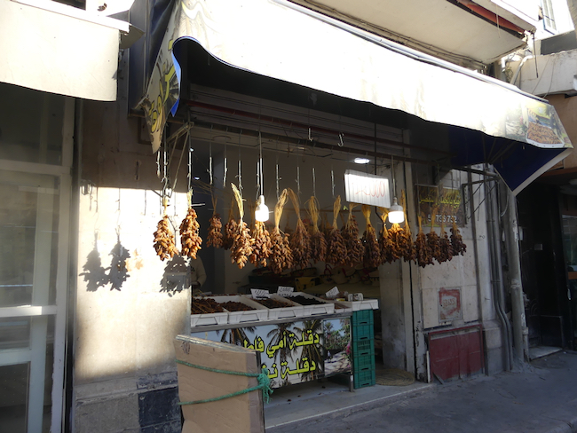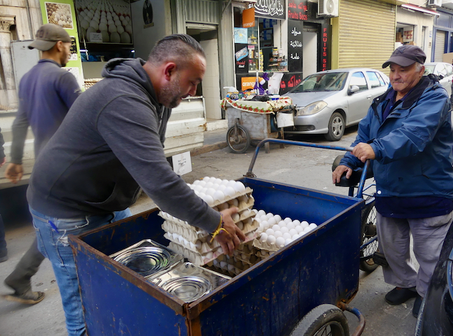 I love this photo. The shopkeeper, trying to keep his street clean and orderly; the donkey, picking up garbage on the street impossible for a garbage truck (and with steps!) and our guide in his traditional garb.