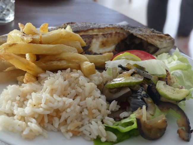 We ordered tourist stuff – fish, grilled peppers, paella. It was good and we had a great time watching all the people pass by.