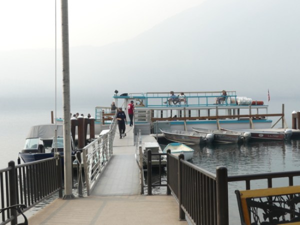 We walk out the front door (the Lodge was built before the road was built, so the front door faces the Lake, and today you enter the Lodge through the back door) to discover there is a Lake boat cruise leaving right now, so AdventureMan buys two tickets and we scamper aboard just in time for a sundown cruise.