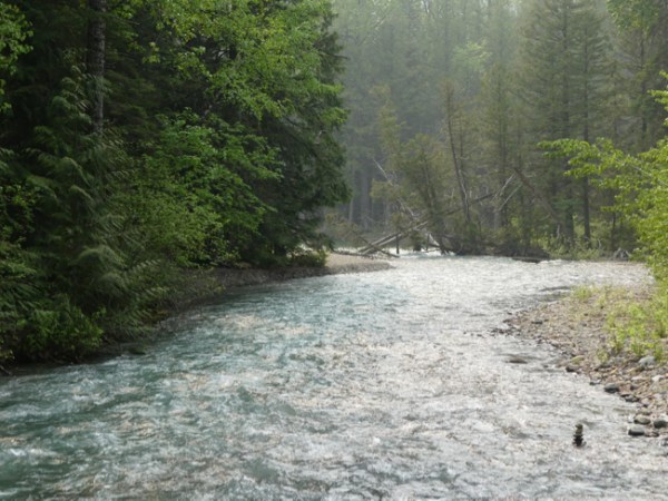 It is dinnertime when we return to the Lodge, and we know where we want to eat. Fortunately, it is early in the season, and we are able to snag a table without a reservation. This is the creek next to the dining room, as it empties into Lake McDonald.