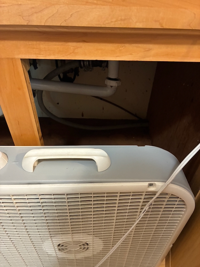 Our normal plumber is a family owned business, with the luxury of taking the weekends off. Fortunately for us, there are emergency plumbers, and we are on the list for one to come today. Meanwhile AdventureMan has found a fan to dry out moisture remaining under the sink, and is continuing on with his baked bean magic.
