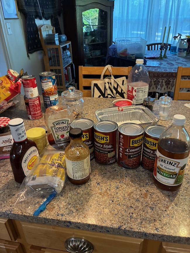 LOL, as I look at this photo, I can see the near-empty tub for the towels on the dining room table, and the bottles from under the sink. And I see that the ham and the bacon are already frying to be added before the beans bake.
