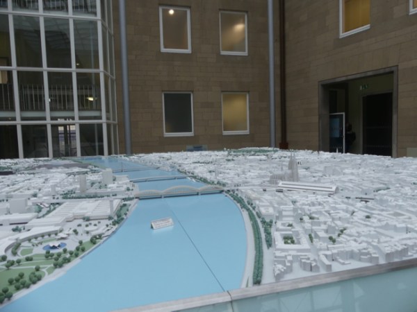 We walked down through the oldest part of town, first, to the Rathaus, the City Hall. Inside, there is this wonderful layout of the city and the river, made to scale, with all the buildings of Cologne.