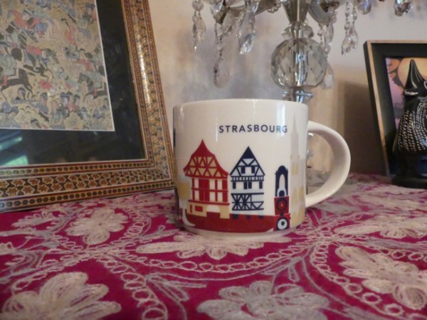 AdventureMan said he had a rotten day in Strasbourg. It was drizzly, and I wasn’t with him. He ate some Persian food, and found some cookies to bring back as gifts, but his heart wasn’t in it. He brought me this wonderful mug from the Strasbourg Starbucks. Remember, I am a Seattle girl, as well as an Alaska girl. I love the mug.
