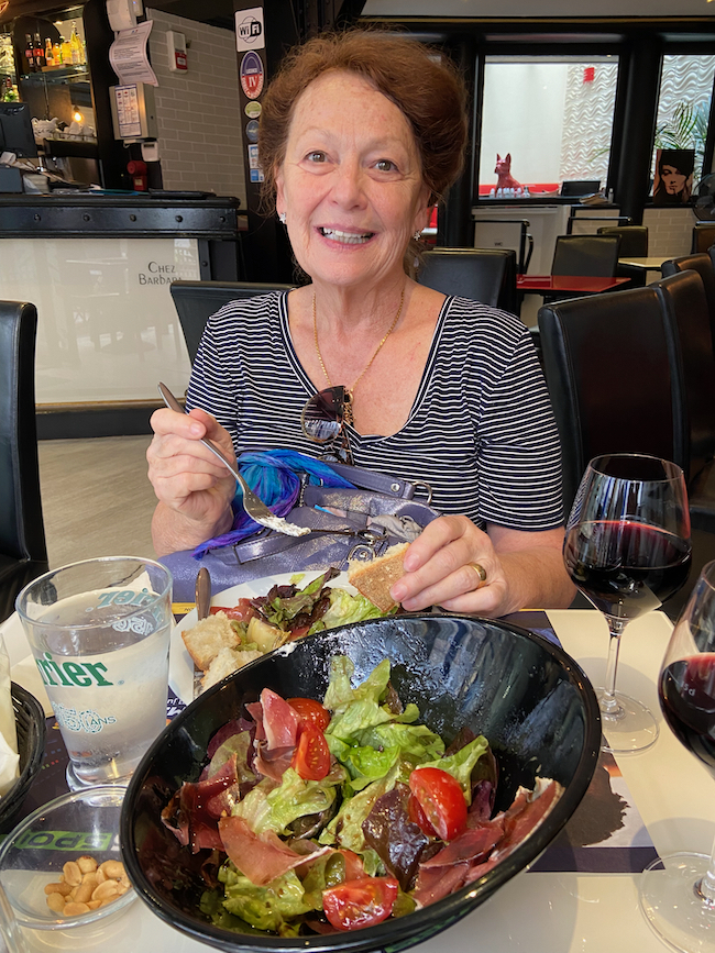 It was also another very hot evening, and we were jet-lagging. We split an Italian salad and a Beouf Bourguignon, and we drank a red Bordeaux. It was a great evening.