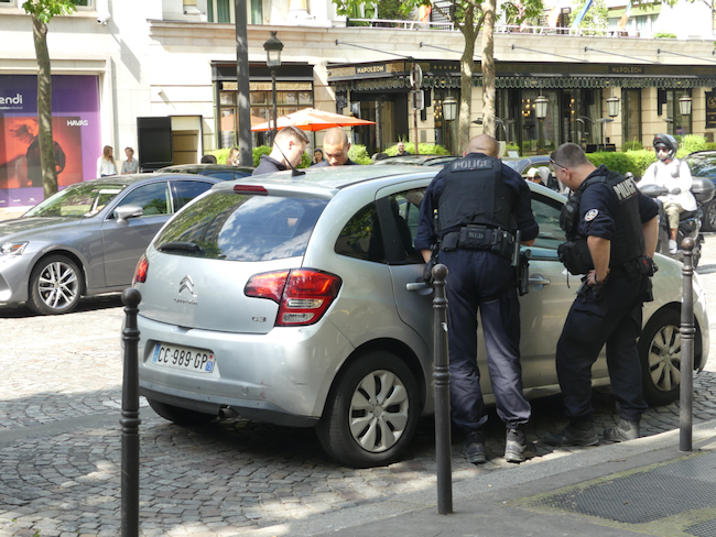 Police presence was heavy. As we ate (again, the windows to the street collapsed to the side, we were entirely part of the outdoors) several police cars came by nee-ner, nee-ner, and on the way back to the hotel we saw a person being ticketed for stopping. It was a chauffeur, waiting for a family dining at Cafe’ de Paris.