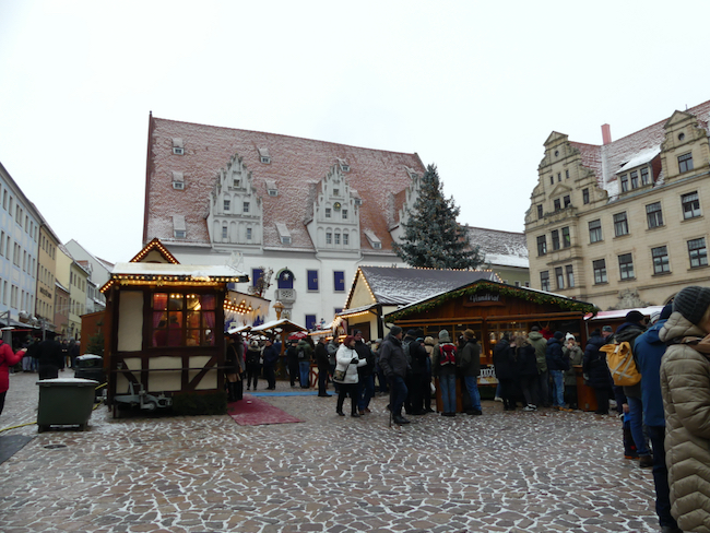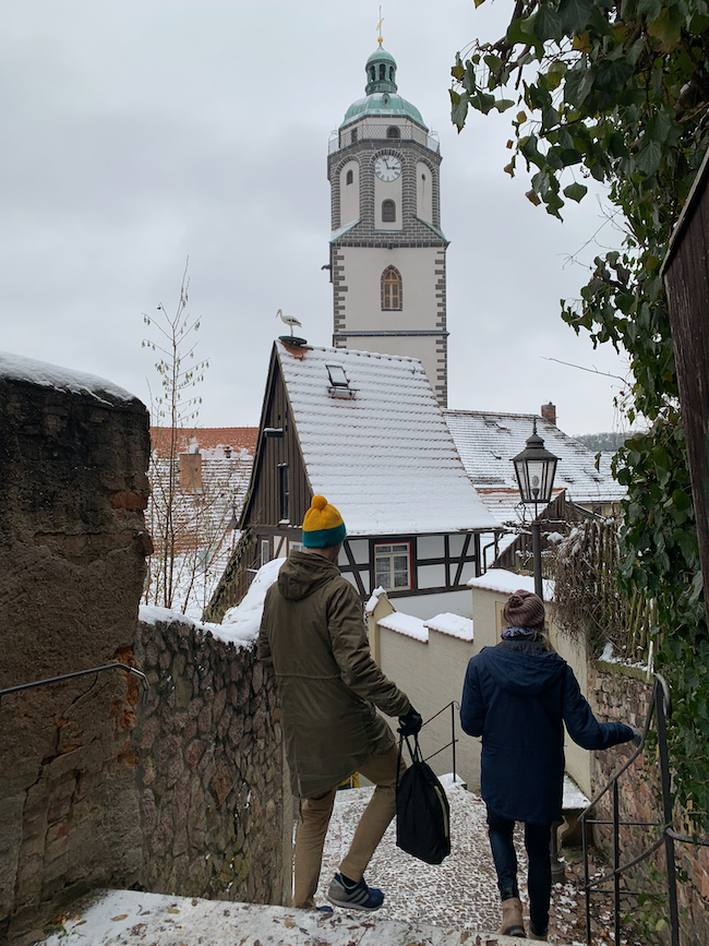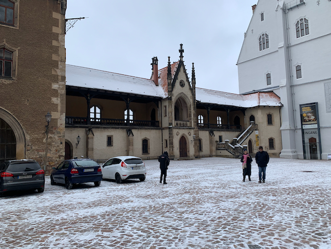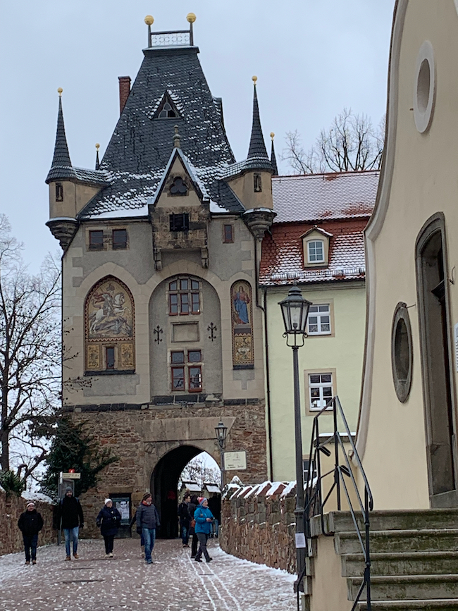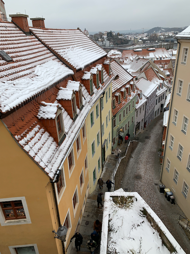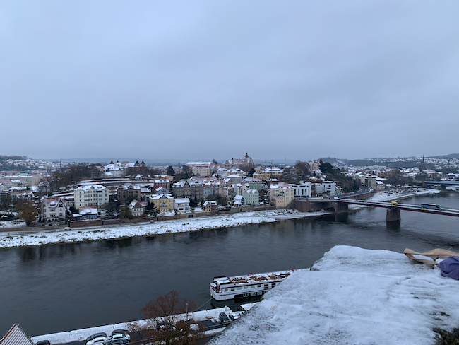 We left Torgau early in the morning cruising slowly through the snowy landscape to Meissen, with an arrival just after lunch. We are all delighted for the opportunity to catch up – re-organize our suitcases, catch up on e-mails, just watch the Elbe drift by – so very rural, all the way. Churches. Monasteries. Fields. People are out walking their dogs. We love that so many wave at the boat.