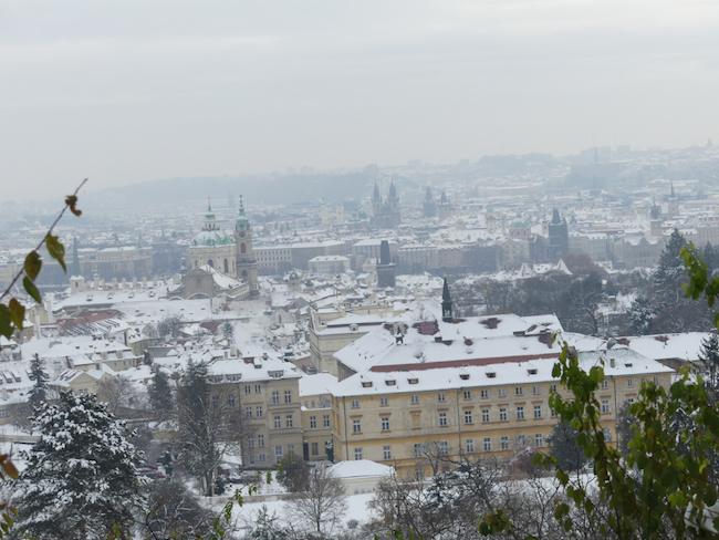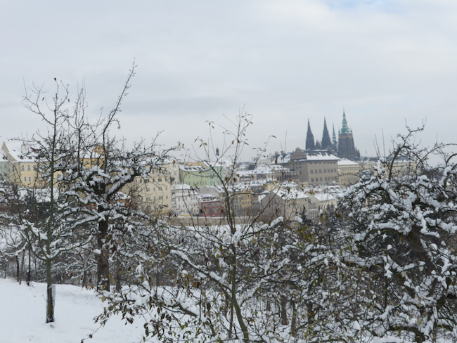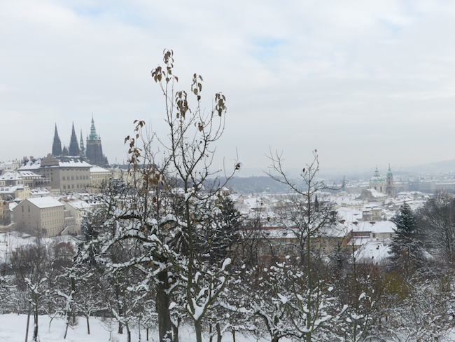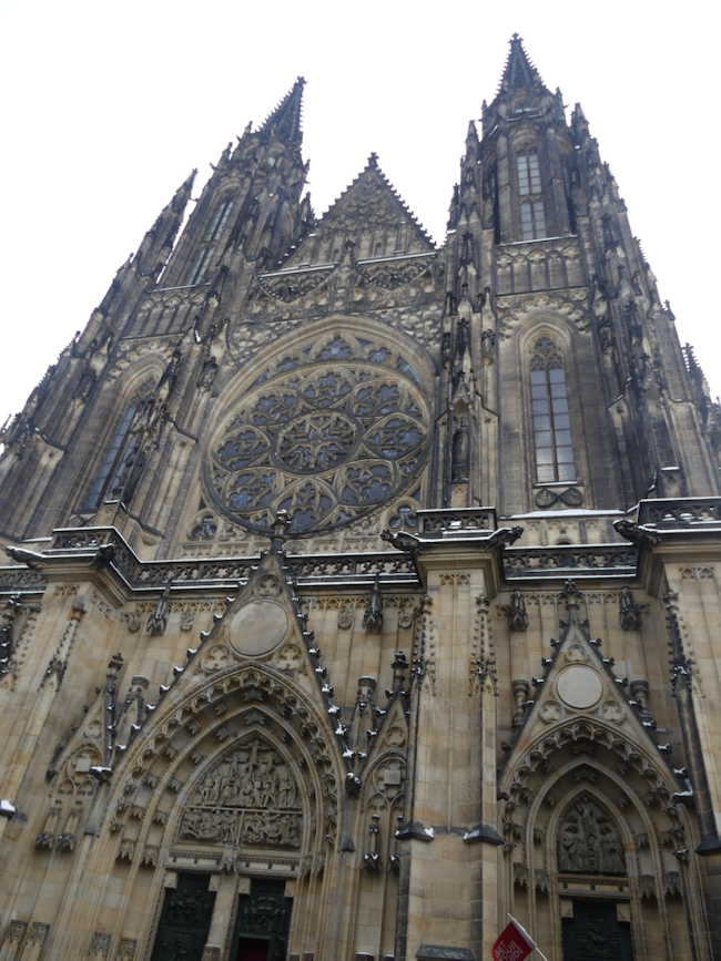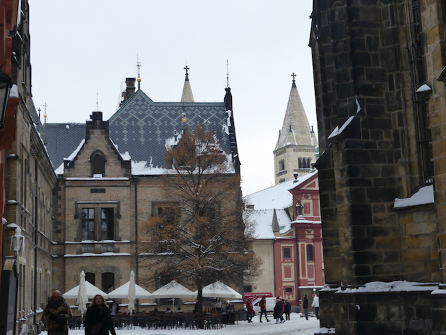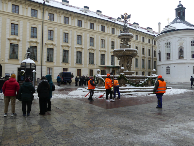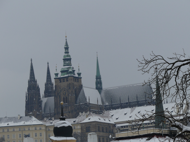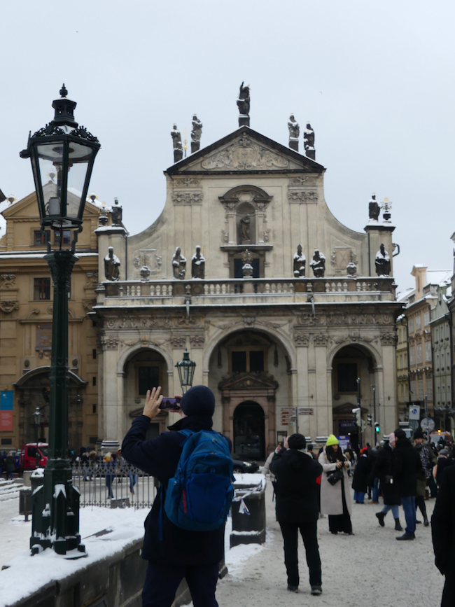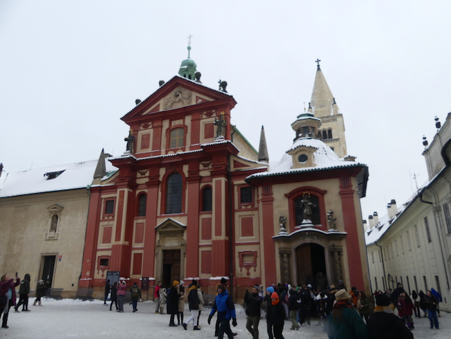 We had some good laughs, and headed toward the Prague Castle, happily all downhill. Entrance was free, and the castle, on this cold, snowy December day was packed with tourists from all nations.