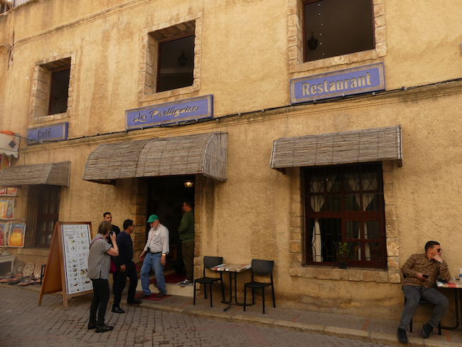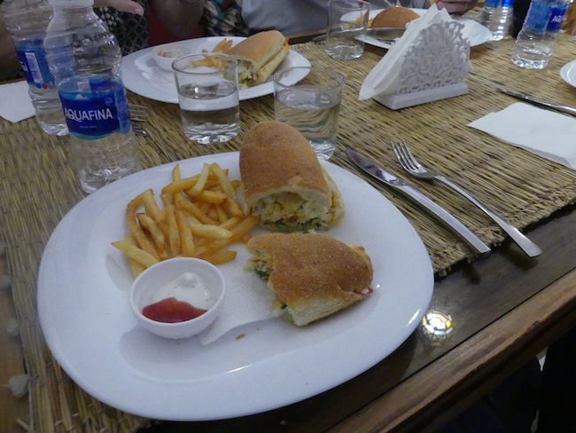 It’s going to be a couple hours ride back to the ship, but the guide has a treat for us – “Snacks” at a local restaurant, part of the tour, no extra charge. The small restaurant was just big enough to hold all of us, had a nice clean restroom and place to wash up, and served these delicious sandwiches, followed by a selection of house baked Moroccan cookies, and Turkish coffee or Mint Tea. The owner and his wife were so hospitable. They made us feel like very special guests. It really was a treat!