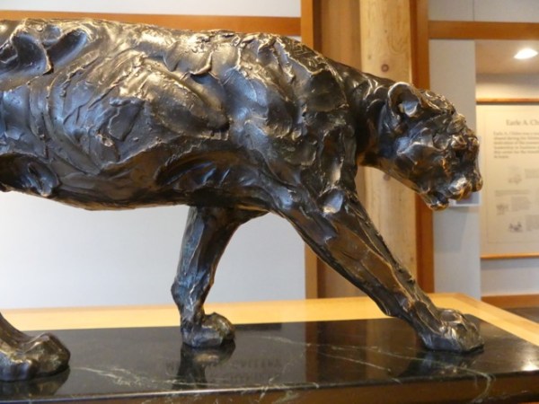 This wild cat sculpture is next to the real wild cat, resident at the museum for many years due to an injury that made it impossible to return her to the wild.
