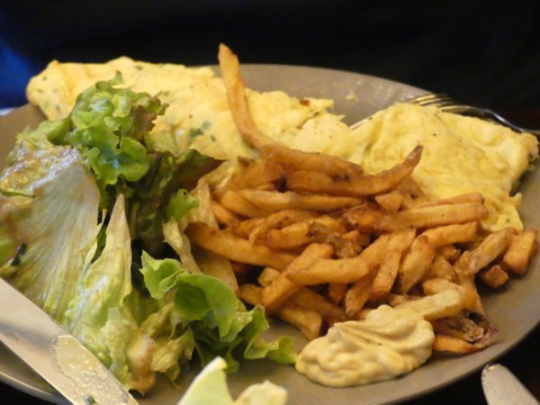 AdventureMan had french fries (actually, pommes frites) with his, and said they were hot and fresh.