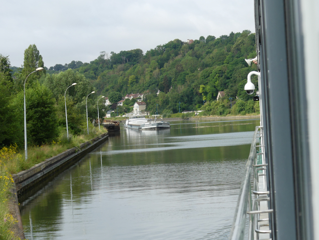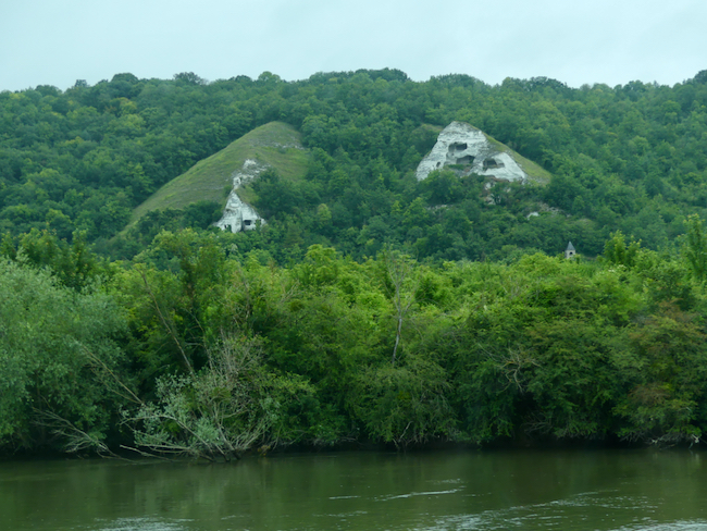 As we are packing, we keep the curtains – and our eyes – open. We are watching for La Roche-Guyon, an ancient castle confiscated by Rommel to be used as his headquarters. I know this because AdventureMan tells me. Several times. He is excited. When we passed it the last time, he was asleep. This time, we will see it.