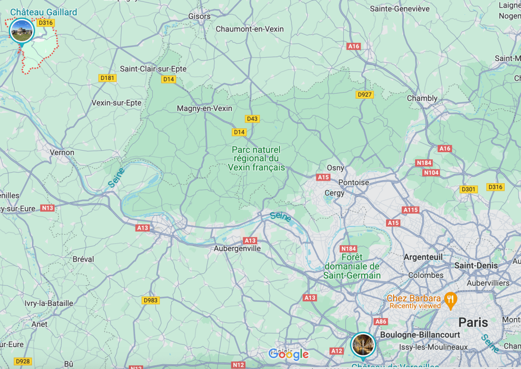 You can see the Seine twist and turn as it flows from Paris to Vernon (and Giverny) and to Chateau Gaillard.