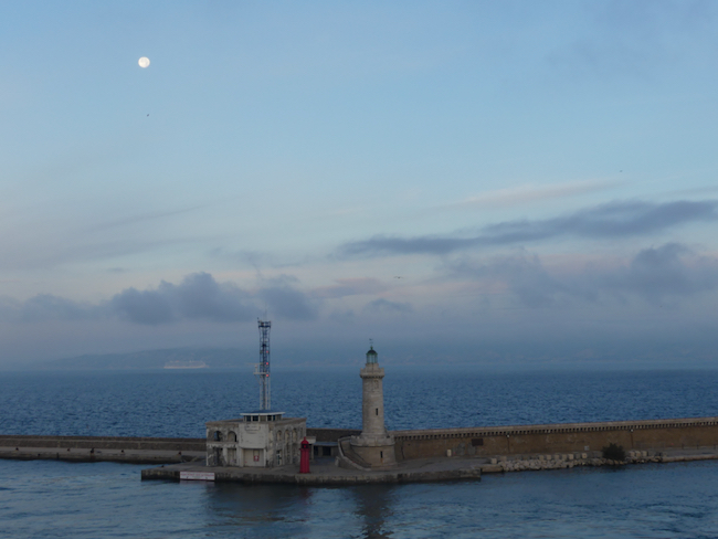 It is very early morning as we approach Marseilles, so early the sun has not begun to rise. The infamous Chateau d’If, made famous in Dumas’ Count of Monte Cristo looms in the semi-darkness.