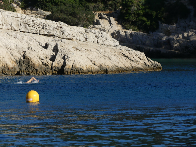 At the beach in Cassis: “In the town, I wear clothes.” LOL it is forbidden to walk around nude or in a bathing suit.