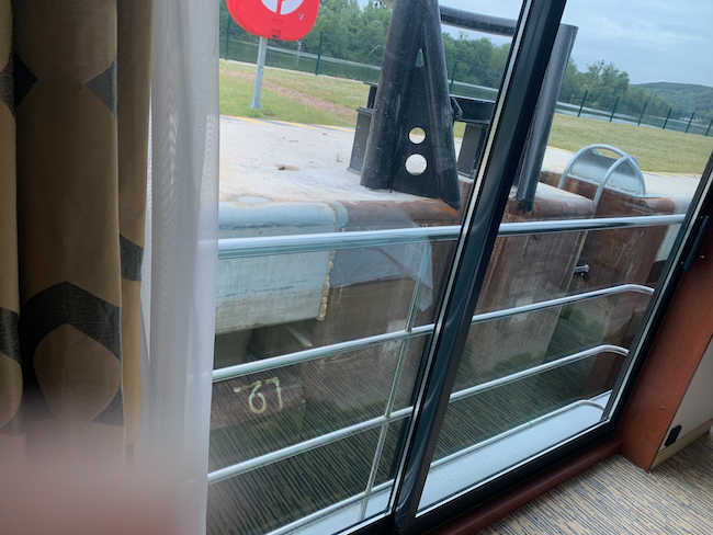 We are tied up on the outside, next to another boat. To get to our rides we will go out the door, up the stairs, across the deck, down the stairs and down the gangplank. You can see the lights of other ship through the windows.