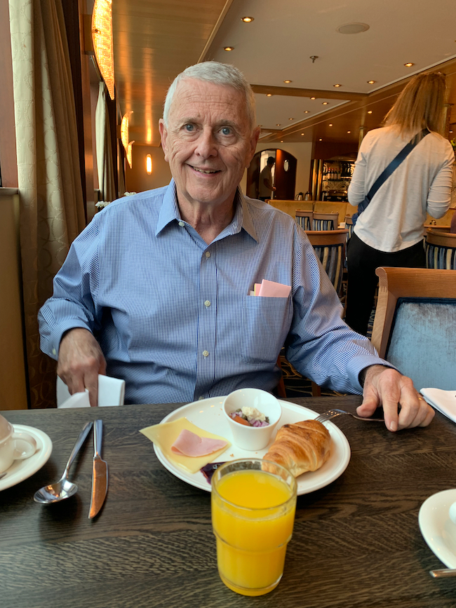 Here’s something interesting to me – we eat like kings. On these cruises, we eat what we wish, and we eat desserts. We are walking so much – most days 10,000 steps or more. Sometimes way more. We are so active, the weight doesn’t stick. Also, we really like vegetables and salads and seafood with lighter sauces or no sauce at all, so we don’t worry, and we don’t gain weight. Also, the desserts served on board are very small, and even so, we might split a dessert so we usually get home our same weight or – even a little less! It’s a mystery.