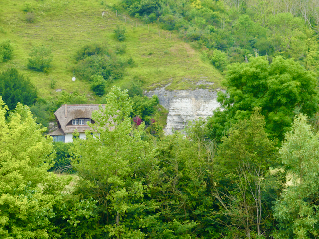 As we are packing, we keep the curtains – and our eyes – open. We are watching for La Roche-Guyon, an ancient castle confiscated by Rommel to be used as his headquarters. I know this because AdventureMan tells me. Several times. He is excited. When we passed it the last time, he was asleep. This time, we will see it.