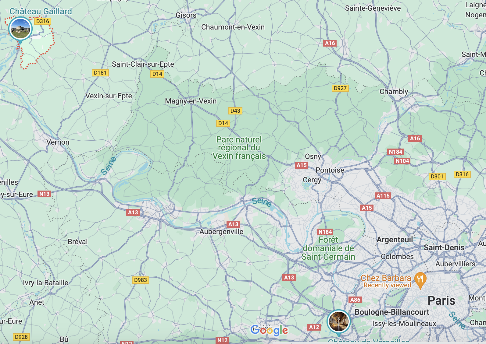 You can see the Seine twist and turn as it flows from Paris to Vernon (and Giverny) and to Chateau Gaillard.