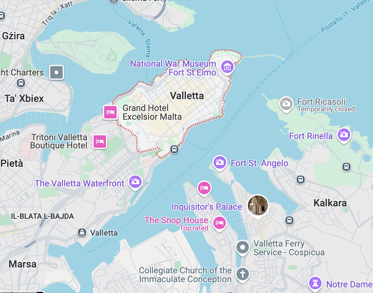 You might wonder why there is a line from Valetta to Mdina that shows it takes two hours and 39 minutes (on today’s roads) to walk from Valetta to Mdina. This is because at lunch, AdventureMan, who is reading The Sword and the Scimitar, expresses skepticism that a young girl could walk from Valetta to Mdina, as she does in the book. On our tour, it seemed like a very long way. So I looked on Google Maps, and it gave me the walking time.