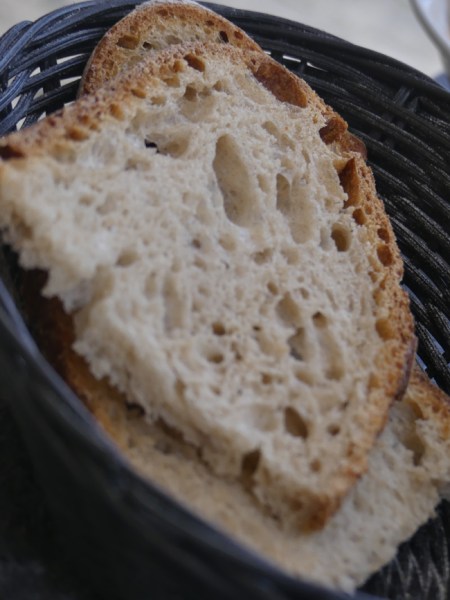 We have the dining room all to ourselves, and the table is beautiful and the food is beautiful. Look at this beautiful bread. It tastes good, too!