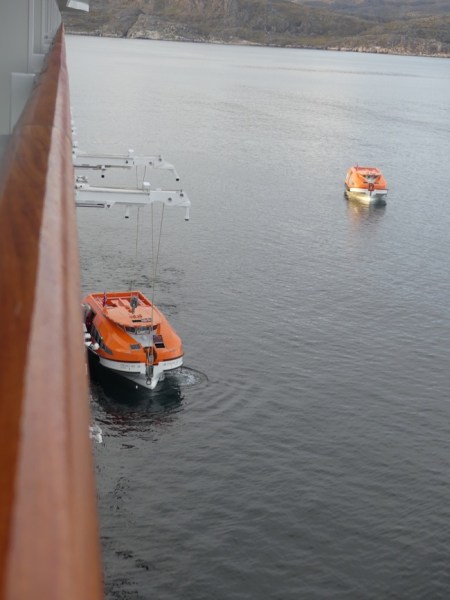 It is really raining now. A tender has just arrived, and a lot of people get off, more people than I would have thought possible. We get on. I learn that a tender can hold a total of 234 people. We head back to the ship. On our way to the elevator, we ask the spa lady if the spa pool is open and she says “YES!” We run upstairs and take off all our clothes and jump into our swim clothes and head down to the hot pool. There is no one else there, just us, rolling around, warming our chilled bodies in the relaxing hot pool and the “ya-kut-zee.” We have a quick lunch, AdventureMan sacks out, and the ship is making rumbles like we are leaving L’anse aux Meadows any minute now. Life is sweet, or as the Captain ends all of his daily announcements from the bridge – All is Well.