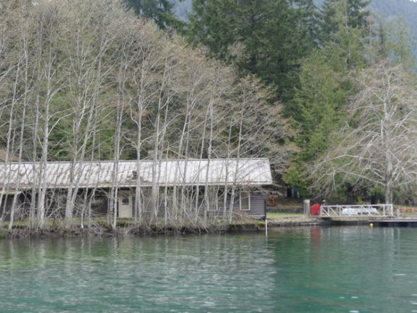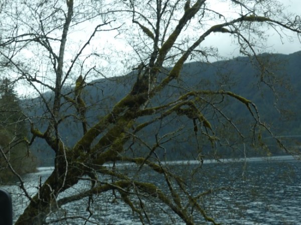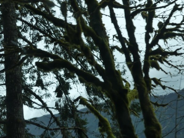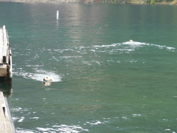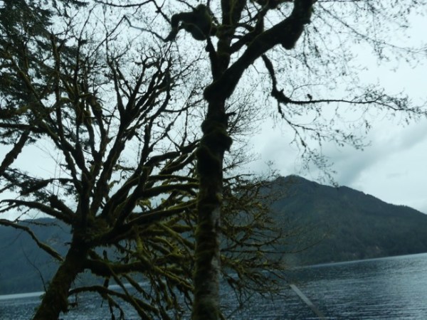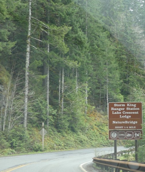 We took a stretch break at Storm King Ranger Station, on Lake Crescent, where one of the funniest incidents on our trip happened. We were walking out on the dock and a group with two dogs were out there, and the dogs jumped in (they didn’t mind the cold water) and swam and swam, the happiest dogs you ever did see. As one was exiting the water, he stopped and pooped. His owner, a young woman, yelled “Oh no! Oh no!” She is waving her plastic poop bag (people are SO conscientious in the PNW) and goes on to wail “How am I going to scoop that poop out of the WATER??”