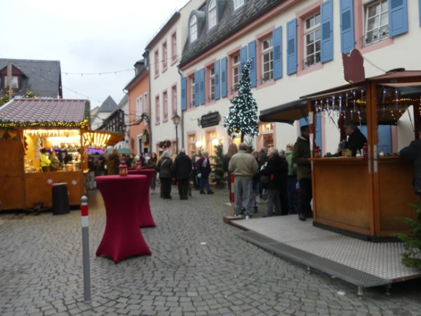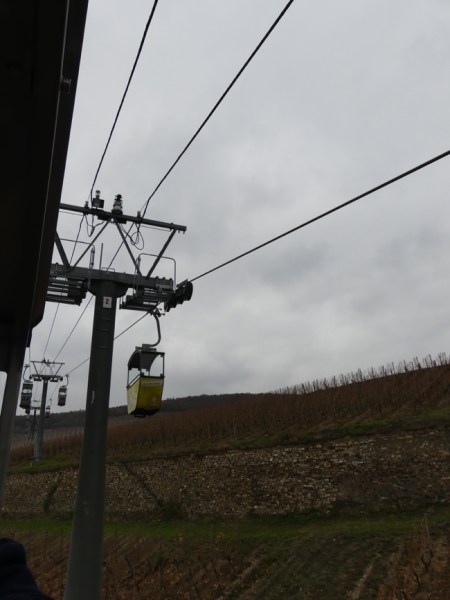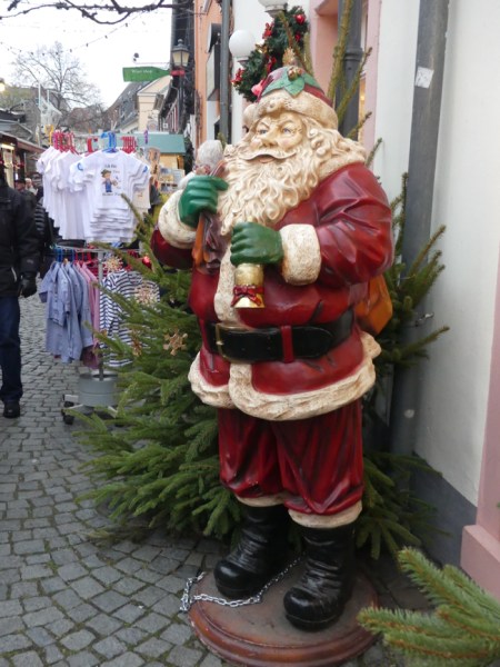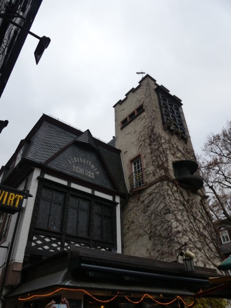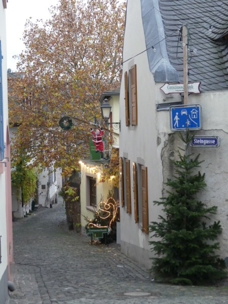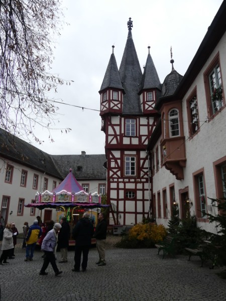 After the music museum, it was time for lunch. We have to give Tauck Tours a lot of credit. Most tourist companies contract for a “good enough” meal, and when we heard “a typical German meal” we had thought we might go off on our own, as we often do, but the idea of lunch at The Rudisheim Schloss (Castle) intrigued us. We were glad we chose to join the group; the meal was done well, starting with a carrot soup and a good traditional German salad, then a schnitzel made with good meat, accompanied by potatoes (I think) and bottles of very nice wine. At each place was also a cup, a gift of the house, in which we could have infinite refills of the Christmas gluewein, spiced wine, all day long.
