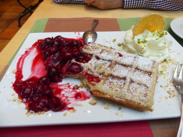 So after wandering around, we decide to go back to the Rudisheimer Schloss and have some kaffee und kuchen, and the waitress tells us “it’s happy hour” for the desserts. She brings us this one lovely Cherry waffle, and oh, it is so yummy, we share it happily. The whipped cream is tinted green, and has pistachios sprinkled on it. We eat it all.