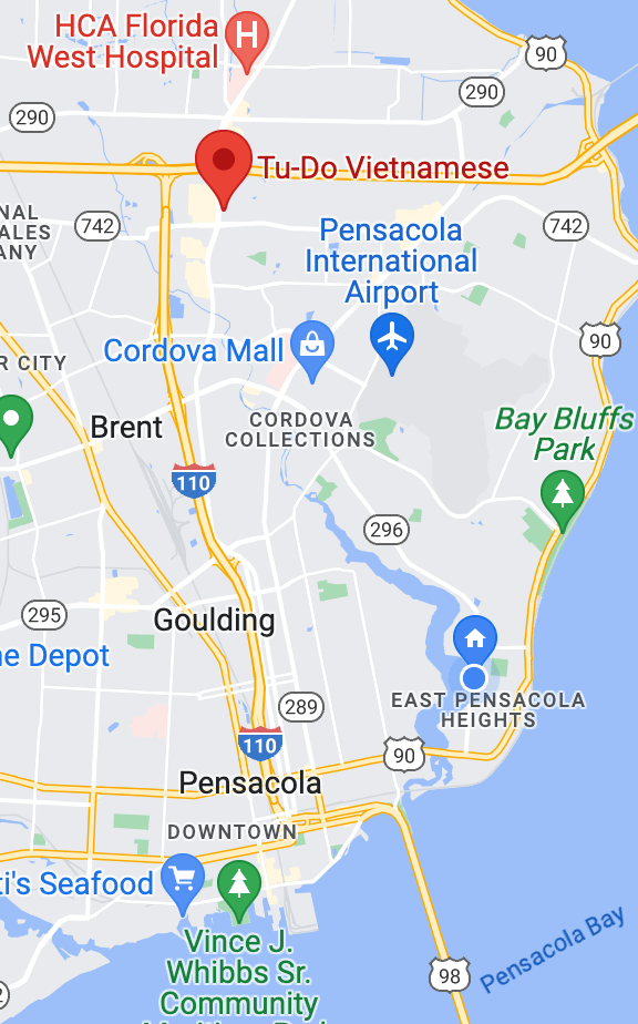 For sheer comfort, for the best Vietnamese Pho and noodle dishes, and when I am sick, Tudo’s is our go-to. Always full of local Vietnamese residents, UWF students and faculty, and medical staff from West Florida Hospital, Tudo’s has great summer rolls (sometimes called salad rolls; the uncooked rice paper wrapped noodle and shrimp rolls served with peanut sauce) and huge bowls of noodles with barbecued chicken, pork, shrimp, egg rolls in any combination you want. I swear that if I start to feel sick, their chicken wonton soup, which we buy by the quart without the wontons, heals me almost immediately.