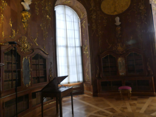 I lived in Germany off and on for many years. As I walked through this sumptuously decorated castle, truly exquisite, I couldn’t help but think how most of the poorest families in the Western World live better than the lords of old. Almost every house now has indoor plumbing and some kind of heat. Those beds, to me, look small, and lumpy. Frederick II who built this little escape hideaway lived a lonely and circumscribed life, with a manipulative, brutal father and heavy expectations on his shoulders. I think of how many people it took to maintain this palace, mostly for one man who entertained little. I think of the lives of those who served him, and wondered what they ate, how they slept at night – the tour did not include the back areas of the palace.