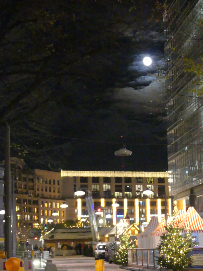 This is Potsdamer Platz, where locals gather to drink the traditional hot Gluhwein, and eat a hot pretzel, or gingerbread, or a long sausage. Nearby are major transportation hubs for busses and for trams and for trains, and a very large mall, which we did not visit. We found a smaller mall, very near us, where we could use the ATMs, find quick meals, and an outstanding bottle of Saxon white wine, which we took with us on the boat to have in our room 😁.
