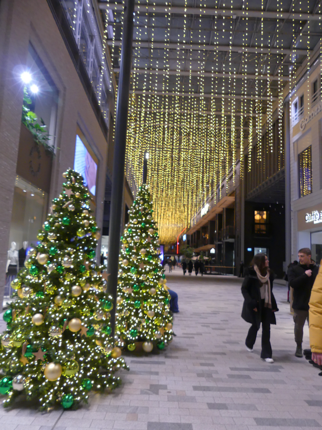 This is Potsdamer Platz, where locals gather to drink the traditional hot Gluhwein, and eat a hot pretzel, or gingerbread, or a long sausage. Nearby are major transportation hubs for busses and for trams and for trains, and a very large mall, which we did not visit. We found a smaller mall, very near us, where we could use the ATMs, find quick meals, and an outstanding bottle of Saxon white wine, which we took with us on the boat to have in our room 😁.