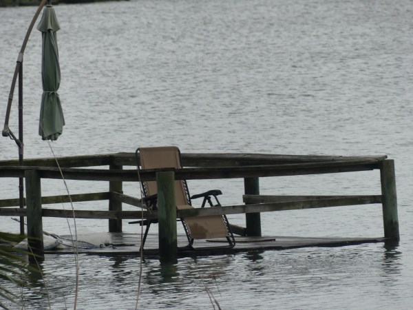 I had thought we would walk further, but at this point, it started raining really hard and I was using my real camera, not my iPhone, so I needed to quit to protect the camera. You can see the water over the dock at this house, and a little lagoon where no lagoon was before.