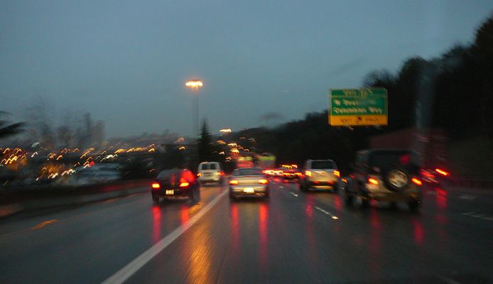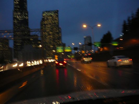 It is, once again, L’heure bleu a la Seattle. It may be four in the afternoon, but it is raining and dark, and traffic is slow enough on the interstate heading north that I can even take (very carefully, of course) a couple shots to share with you the thrill of coming into Seattle in November: