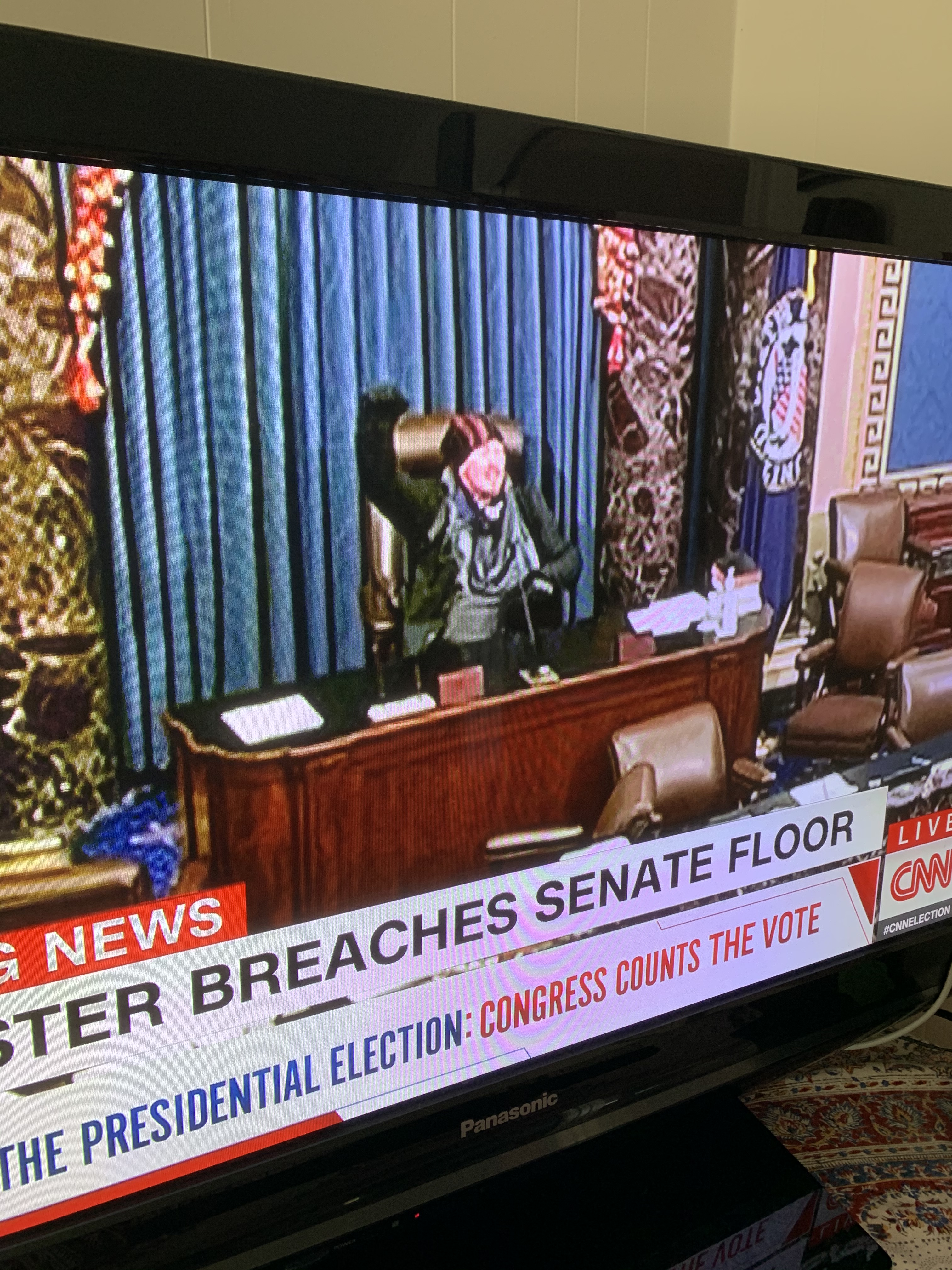 So as we are eating lunch and Mitch McConnell is on CNN making an astonishing speech supporting accepting the electoral college votes for Joe Biden, so astonishing it caught our full attention, and then all hell broke loose. There was a rallying speech by our Fearless Leader, who assured his followers once again that the election had been stolen and he was going to march with them (he didn’t) to the Capital where the senators and congresspeople were meeting, and they were to show how strong they were, and not be weak.