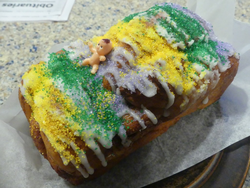 Our particular poison is the King Cake from Craft Bakery on Davis. It actually is not too sweet, is not loaded with excessive frosting and sugar, has just enough cinnamon, and comes in a size that two people can sliver to death in a day or two. They do have larger, more normal sizes for larger groups. These small loafs are more than enough for us.