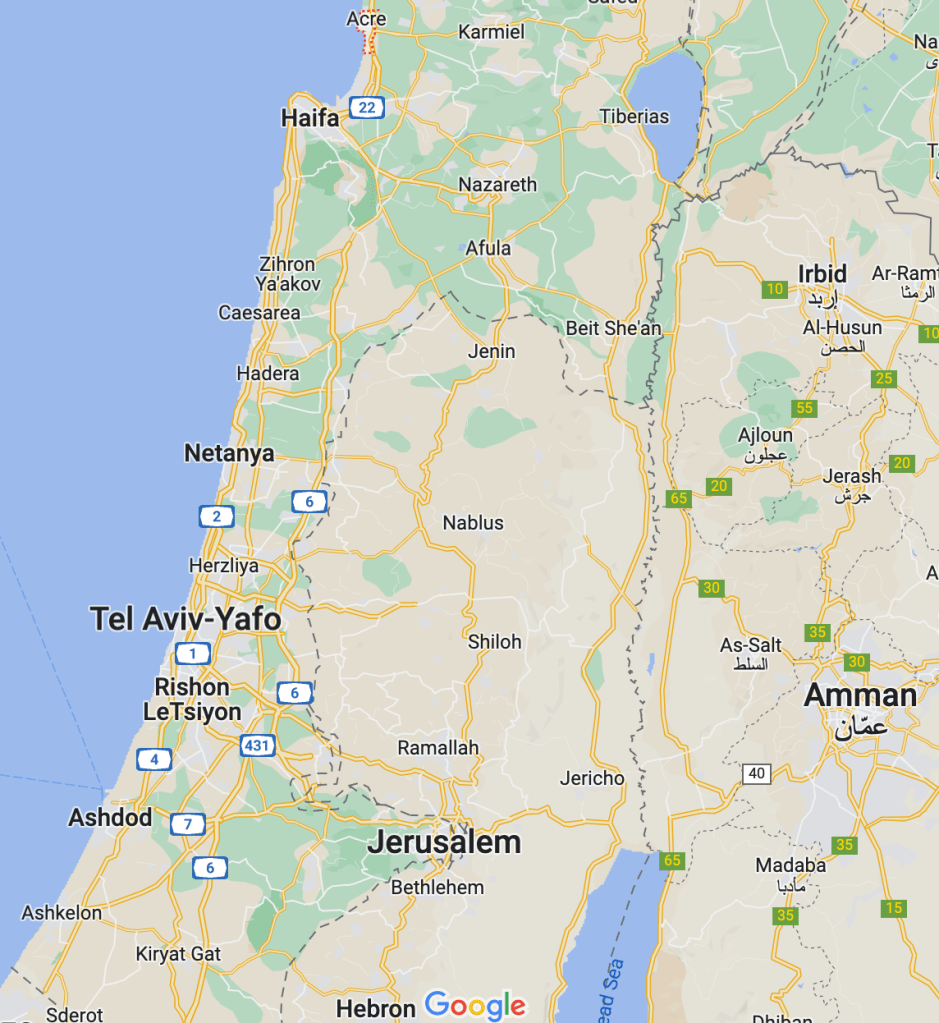 First, a little orientation. On the map above, in the upper left corner, you will see Acre, and just south of Acre you will see Haifa. At the bottom central, you will see Jerusalem / Bethlehem / Hebron and a short distance to the east of Jerusalem you will see Amman, Jordan, where we lived for two years several years ago.