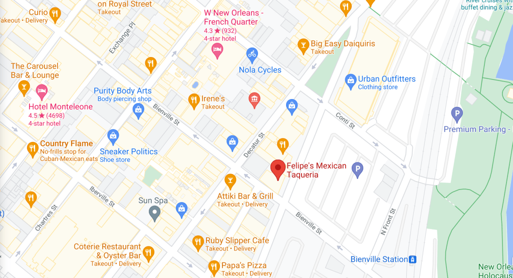 This is not a fancy place, not at all. This is a place where you order at the counter, and carry food to a condiments stand and then to your table. There are no tablecloths. It is full of French Quarter workers finishing their shift providing hospitality for New Orleans visitors, tired, hungry and knowing where to find a good meal at a reasonable price, and a glass or two or three of beer. Chips and salsa, tacos, burritos, beans and rice – the basics, done well. Our grandchildren can always find something or order, no one cares if something spills, it is a little noisy and chaotic – a great place to take kids, and enough on the edge of the French Quarter as not to be a problem.