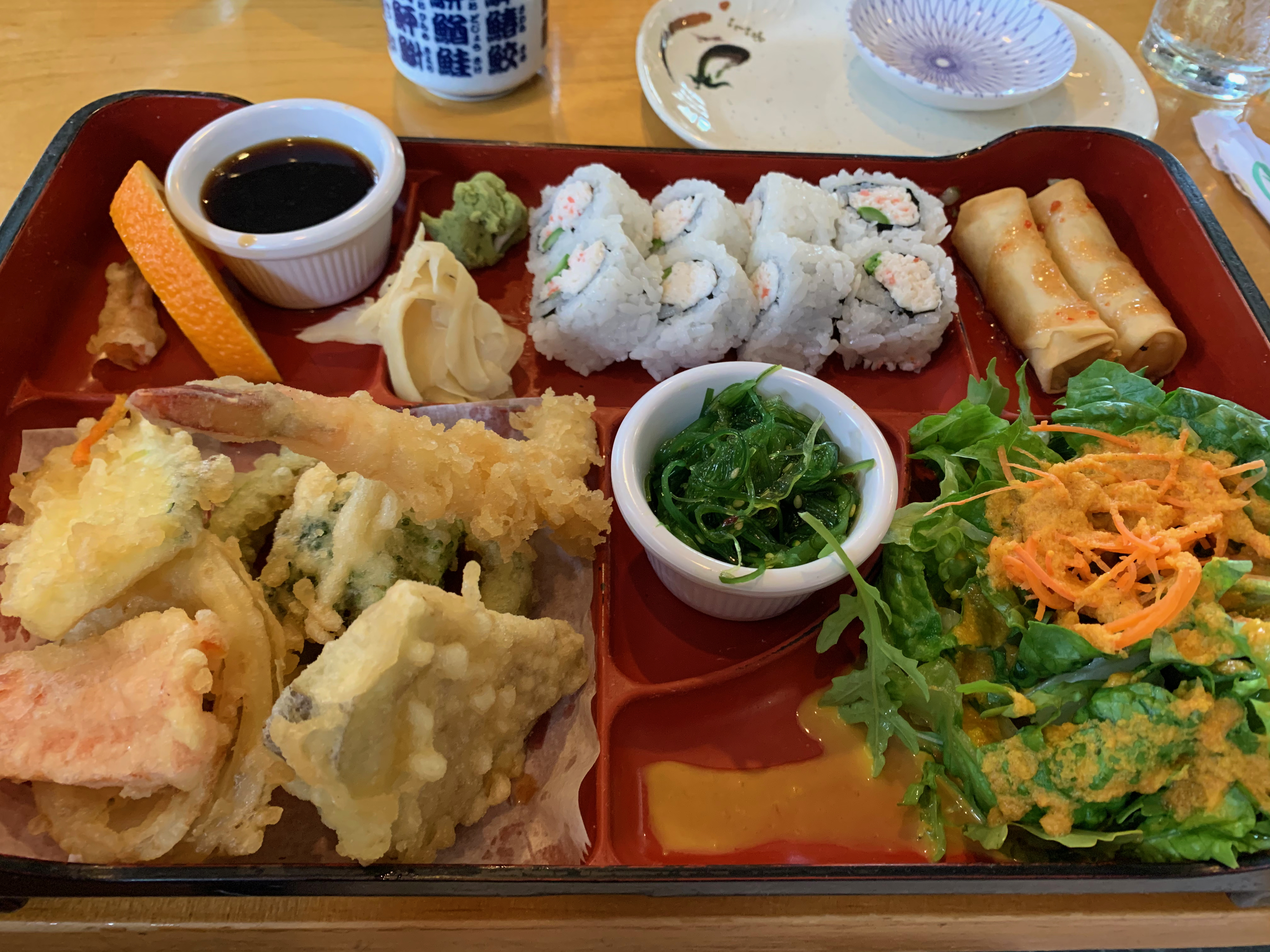 I am embarrased to tell you, this is my order. So much food! It is more like a complete Bento box, with soup and salad and rolls and even the seaweed salad I adore. Sadly, we couldn’t take it with us. I shared, but it was too much food. I later saw on the menu I could have ordered just the tempura; that would have made a better meal for me. Ah well, next time 🙂