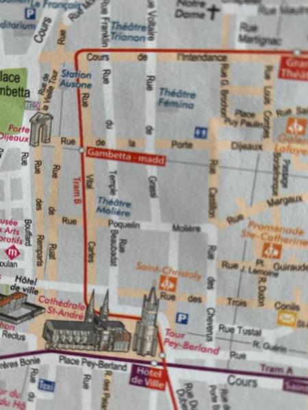 We had found a hotel, The Grand Hotel Francais which is also a Best Western. It is beautifully located near the Grand Theatre and just up the street from Saint Andre’s. I can’t figure out how to make a mark on the map, but up in the upper right corner, just where the red line B (tram) makes a turn, you see Rue de Temple, and the Hotel is on that street. The location is very quiet, but it is walking distance to everything!