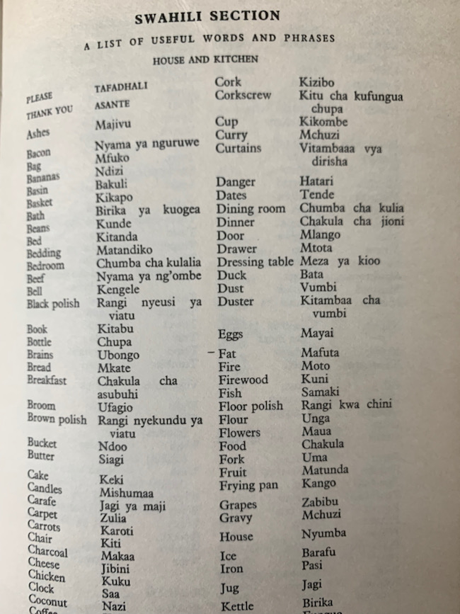 ThIs is the first cookbook I ever bought for myself. I still love it and can’t part with it. I bought it in Nairobi in 1973. It has some great recipes, but most of all, it has an entire culture full of differences, with a guide to organizing a large camping trip into the wild, foods for invalids, pages of instructions for servants on how to do laundry, clean, etc., and an entire section on asking for what you need in Swahili.