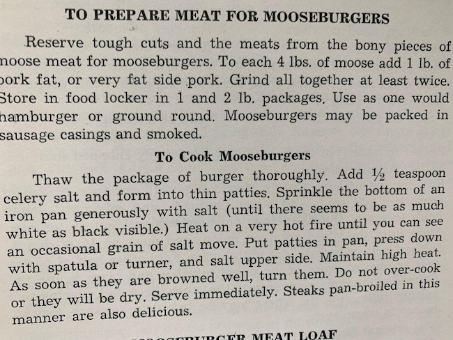 I can imagine there might be a way to fix moose burgers that would be tasty and delightful. As a child, I remember moose burgers as being tough, always, and chewy, and, well, game-y. Our dads hunted in the Fall. There were big hooks in our basement where they hung the deer or moose when they brought the hunt in, and where they skinned and quartered the meat. The butcher would grind the moose meat and package everything up in white freezer paper. The meat would be stored in the cold storage locker, and Dad would stop by during the winters and bring something home. The only thing worse than moose burgers were bear burgers.