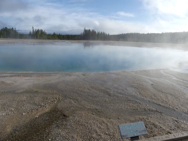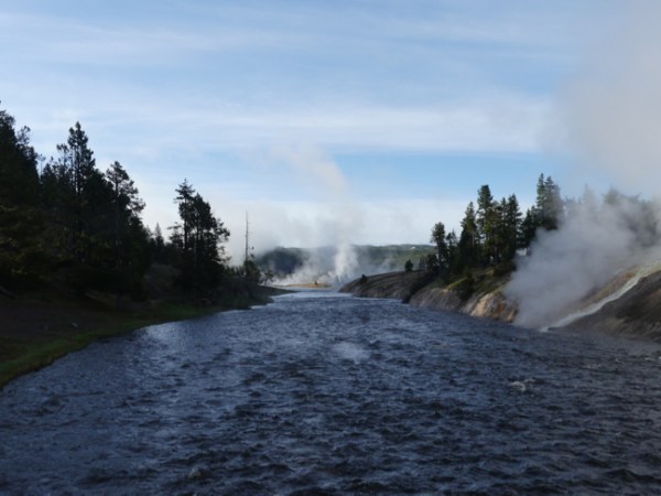 There is a trail, only .6 mile, that starts at the Angel Falls Trailhead and takes you to an overlook of the Middle Geyser Basin, and maybe this would all be more impressive from there. AdventureMan asks if I want to go hike the trail and I say no, there is too much steam. Even from above, cold morning, hot steam, visibility is poor. We’re coming back next year, maybe I can hike it then on a different day and get a different result.