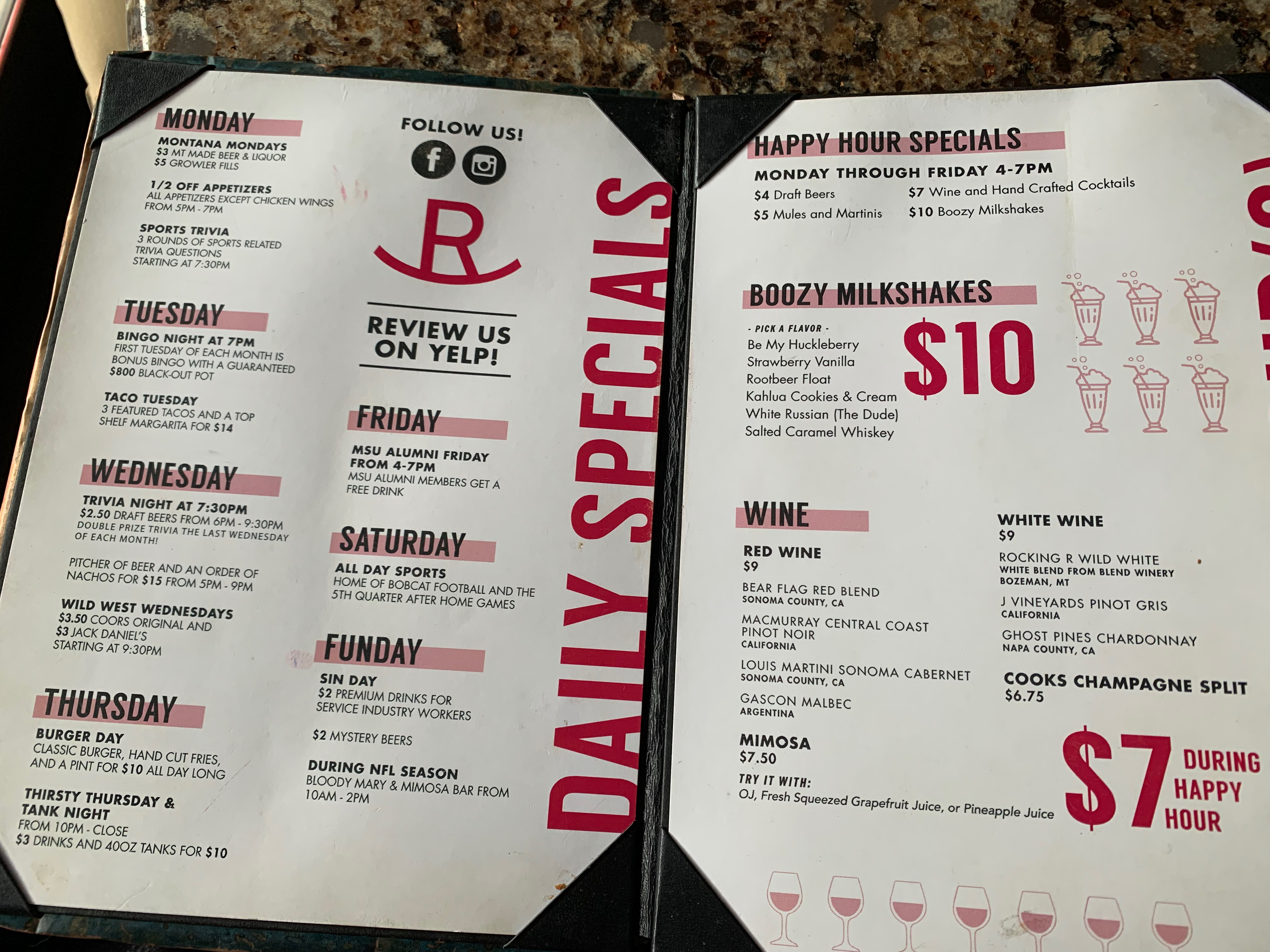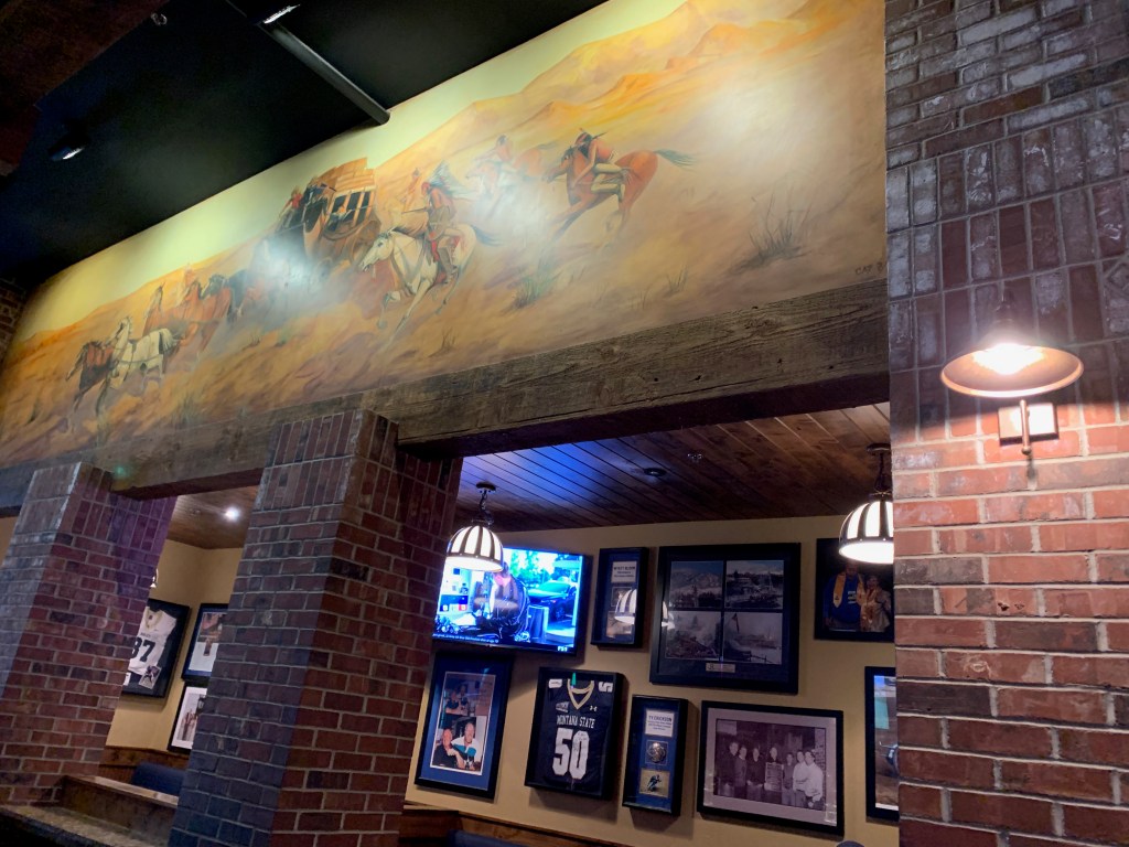 We parked downtown when we found a place that looked wonderful and had a smoker out front, but it turned out to be a fine food purveyor, not a restaurant. We asked her for a recommendation, and she said ‘You have to go to the Rocking R” so we did. The Rocking R is actually a bar, a great cowboy bar, and the restaurant is called Hail Mary. We both had elk burgers – hey, we’re in Bozeman – and they were delicious. I think mine was called something like the Outlaw, and my beer was a Maverick Mary; it tasted good and because I don’t drink much, half a beer and I was buzzed. I also had roasted shaved brussel sprouts to salve my conscience. We had a great time. We are happy just to be back in Bozeman.