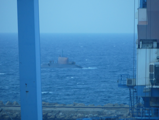 We took a snooze. That’s what cruises are all about, sleeping, eating, (for some, a lot of drinking) and a little bit of touring. Many passengers took long day tours to Jerusalem or Masada or the Dead Sea and are not back yet, so we made a last-minute decision to go to tea at 4:00 while there isn’t such a crowd. Great decision. Very low attendance, most tours were not back, and our friends Ed and Alan were there. We chatted with them, had some tea, listened to a string quartet, and spotted a submarine monitoring the harbor. Yes, really.