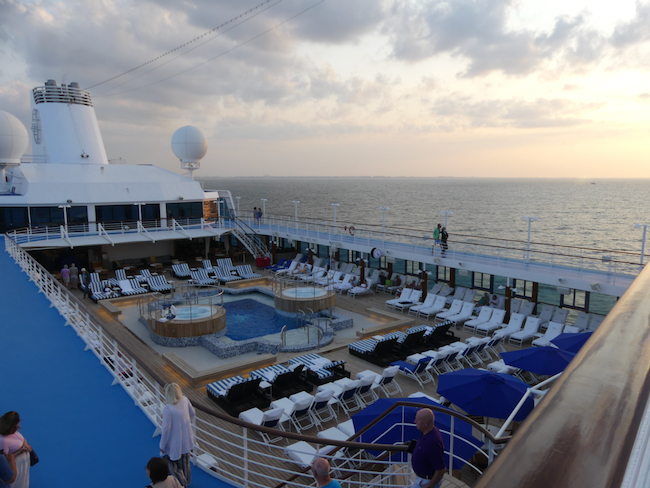 I felt great, but I needed coffee. I dressed, went up to Horizons to get coffee, and there was coffee! There were not many people who thought this was worth getting out of bed for, but I didn’t want to miss a minute. I found a couple other early birds and we went up to the top deck.